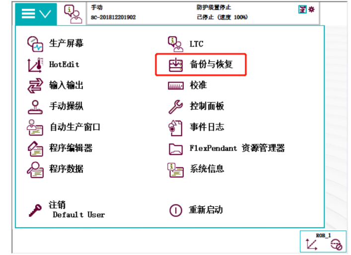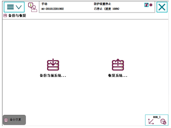 1. 其次点示教器面板的菜单,点击备份与恢复。