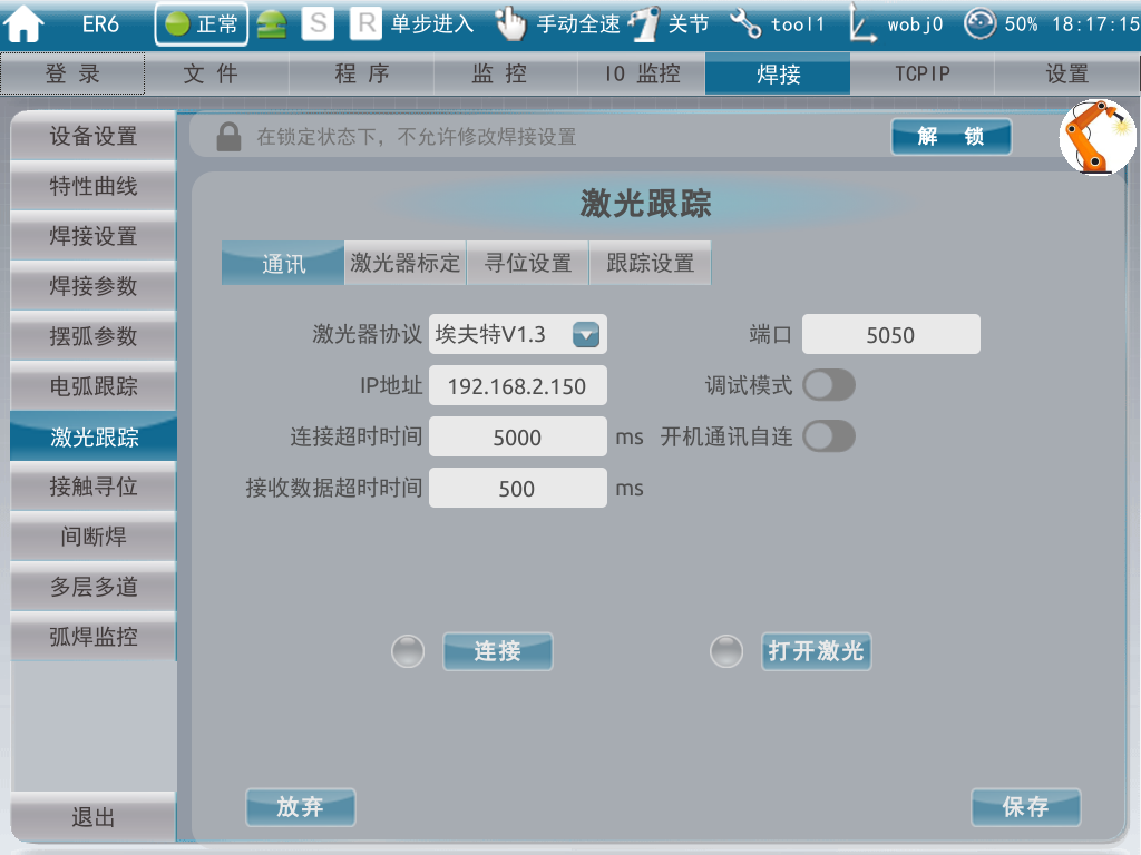 埃夫特机器人在使用传感器功能时,需启用通焊接与TCP IP选项,否则将无法正常使用。请根据下文引导步骤进行启用。