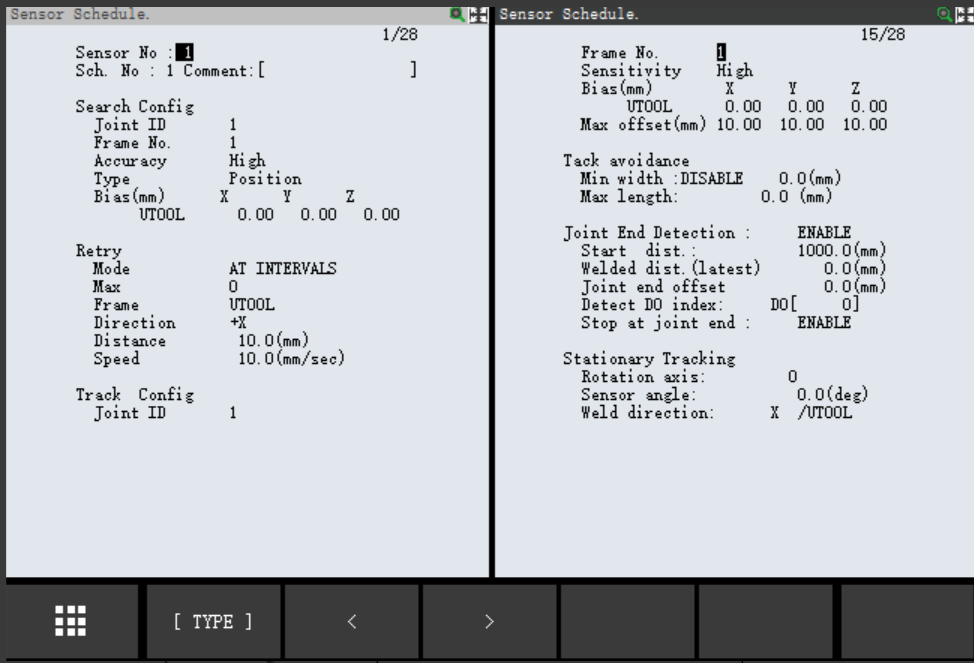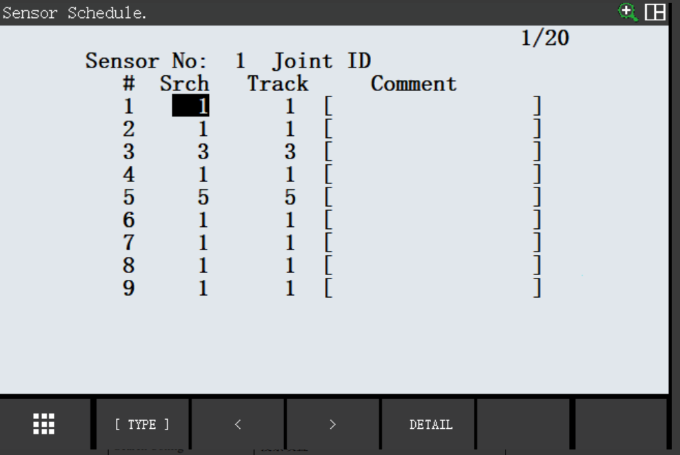 按 DATA 键,依次选择类型>Sensor Sched,进入到激光跟踪条件设定界面。