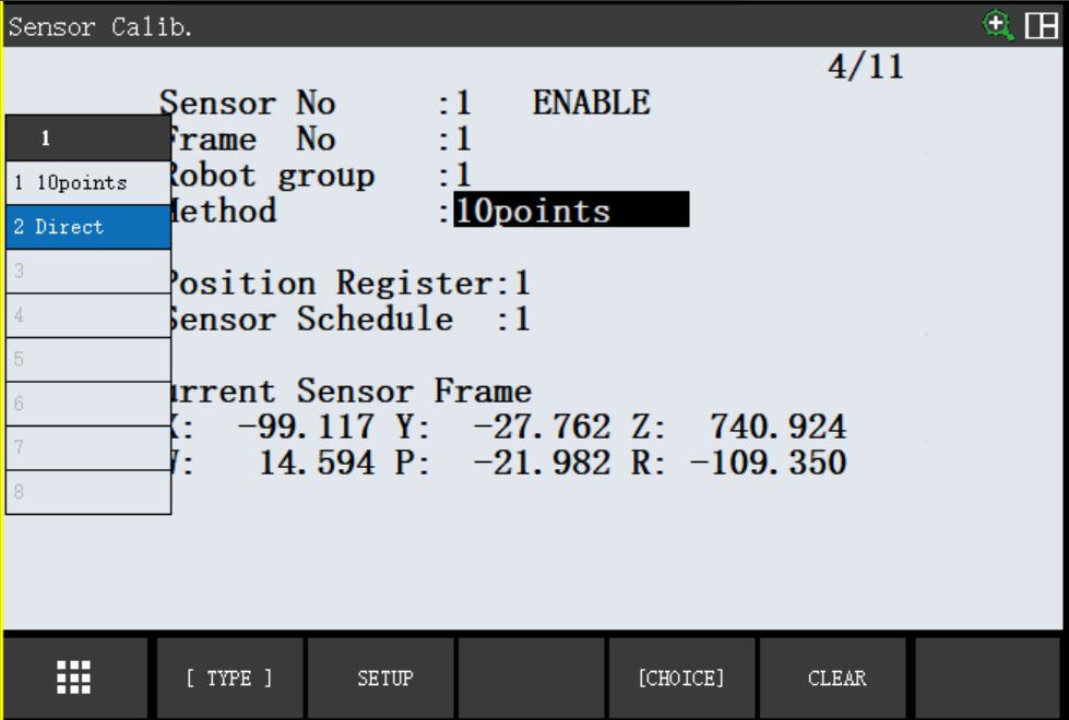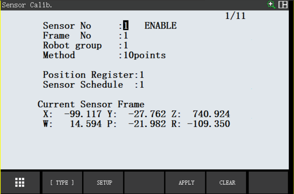 在示教器中依次点MENU>设置>Sensor Setup>CALIB,进入到激光器标定界面。