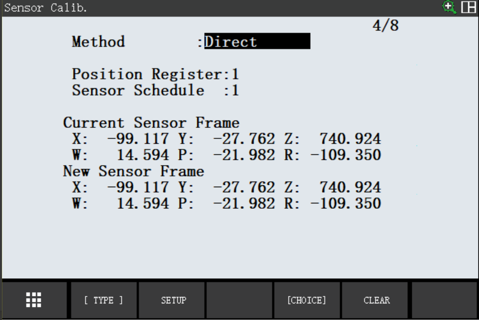 Direct,将相对法兰的数据填入New sensor Frame,同时按SHIFT与F4,将结果应用后标定结束。