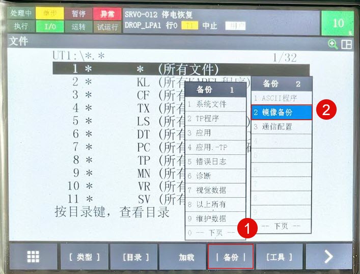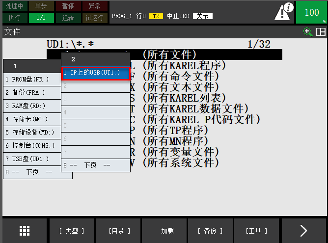 USB(UT1:):若您备份镜像的U盘从机器人示教器连接,请选择此选项。
