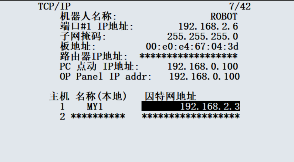 192.168.2.1,路由器 IP 地址也设置成192.168.2.1,然后在下面主机列表中,将主机名称(本地)设置成MY1,因特网地址设置为192.168.2.128(请以4.3.1.3实际设置的IP为准)。在示教器中依次点击设置>主机通讯>显示>客户端,根据现场情况(单机或双机),将端口改为上文4.3.3章节图表中对应的端口号。