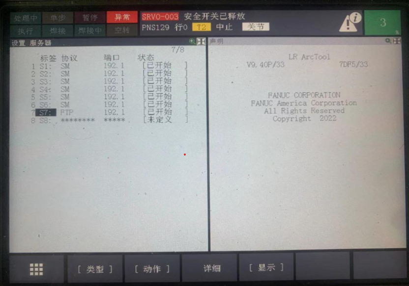 在示教器中依次点击菜单>下一页>系统>变量>$AVST-JNTNUM,把10改为200。再依次点击FCTN>控制启动。