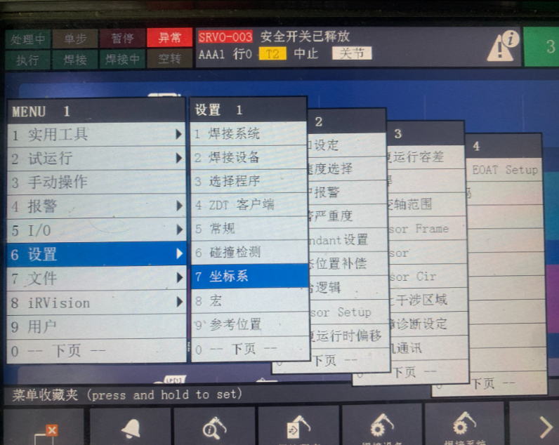 在示教器主页面中,依次点击MENU>设置>坐标系。