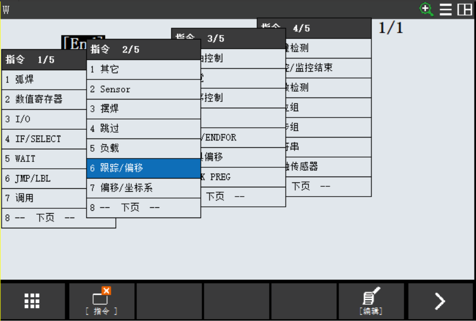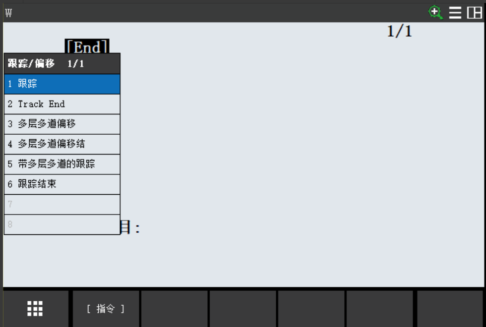 该指令插入方式如下: 在程序编辑界面,点击指令>跟踪/偏移,里面包括以上两个指令,其中第一个为 Track DPM 指令,第二个为 Track End 指令。