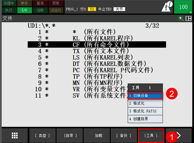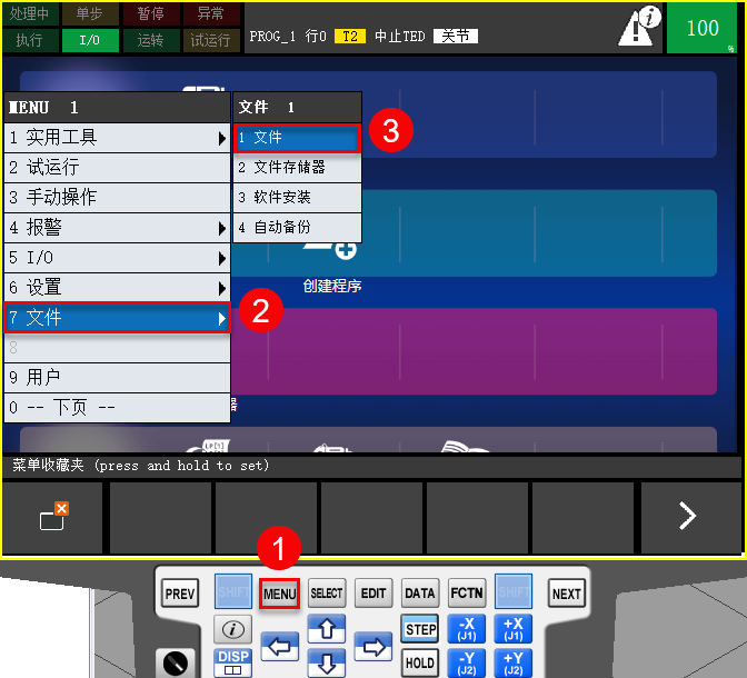将U盘插入示教器USB接口,并在示教器中点击菜单按钮MENU后,依次点击7 文件 > 1 文件。