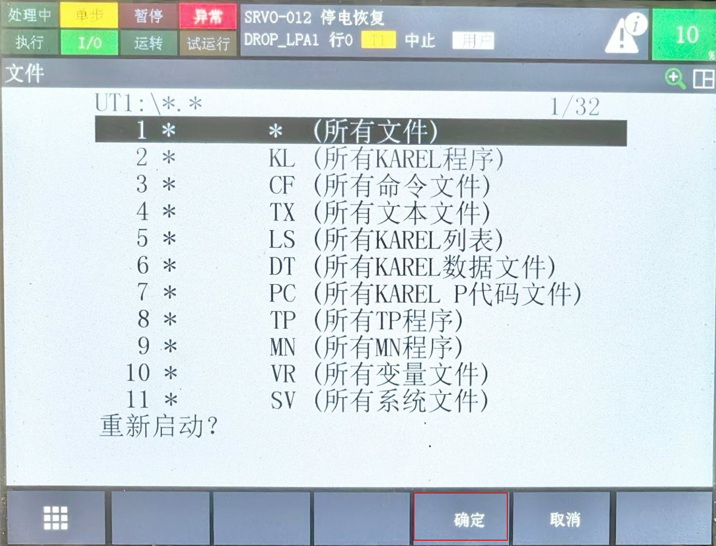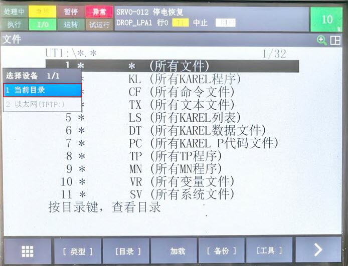 在示教器中依次点击MENU>7 文件 > 1 文件。