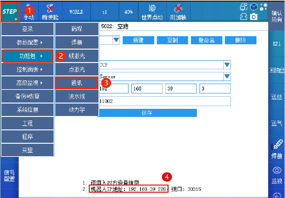 如右图所示,在示教器中依次点击STEP > 功能包 > 通讯。