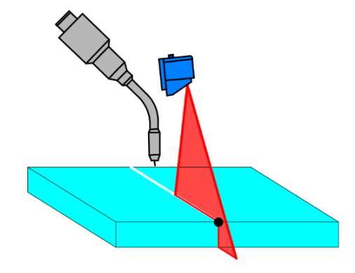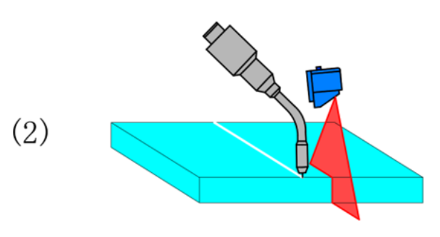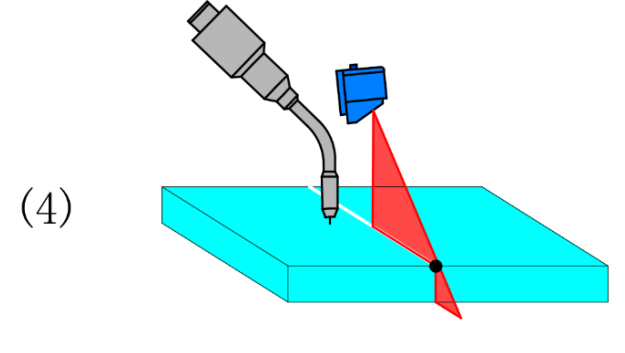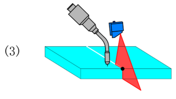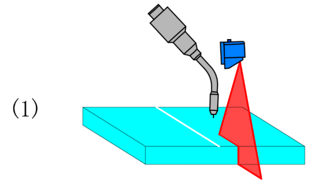 标定板取台阶或边缘焊缝,如图所示,识别位置为矩形板的上边沿焊缝,红色线条表示激光线,白色表示参考线。
