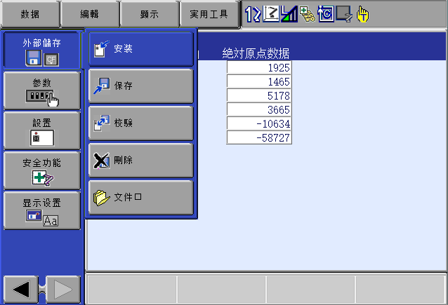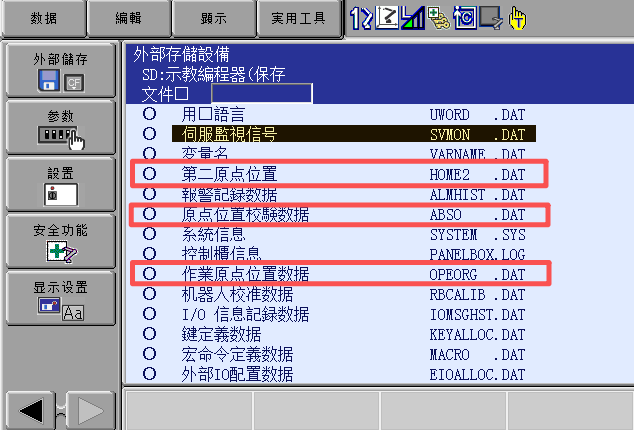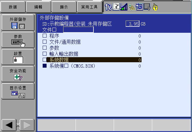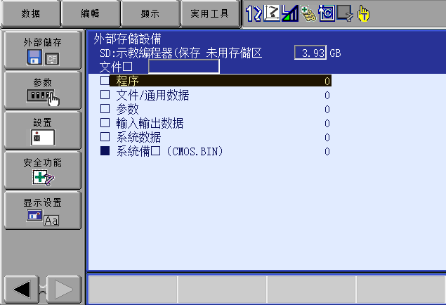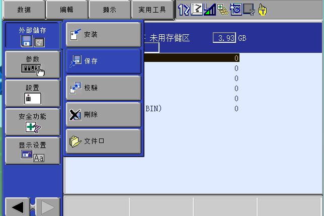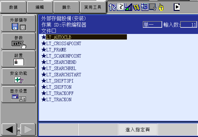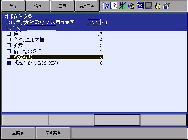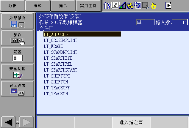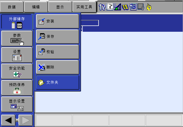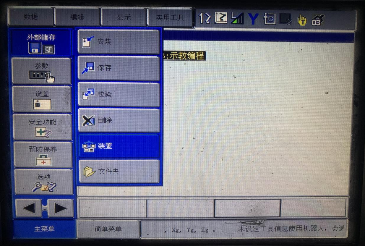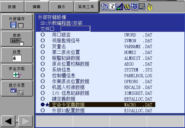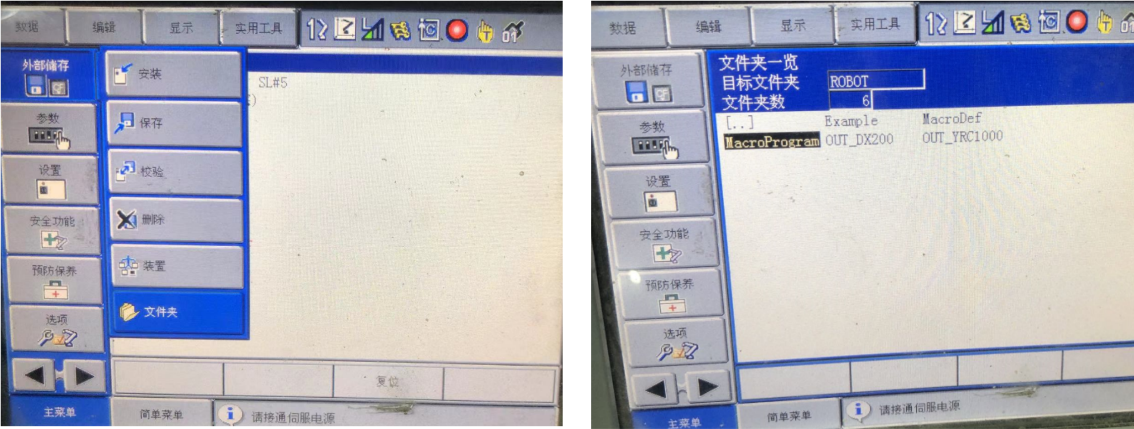 将MacroProgram中的宏命令程序文件拷贝到机器人控制柜中。在主菜单中依次点击外部储存>安装,显示安装画面。