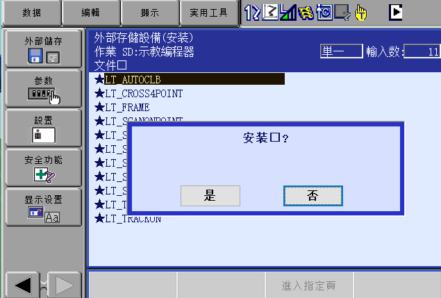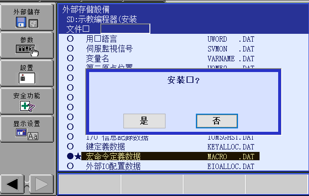 回车,显示确认对话框,选择是,将新的MACRO.DAT文件安装到机器人控制柜中。重要安装