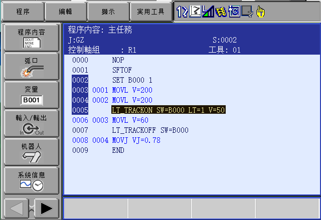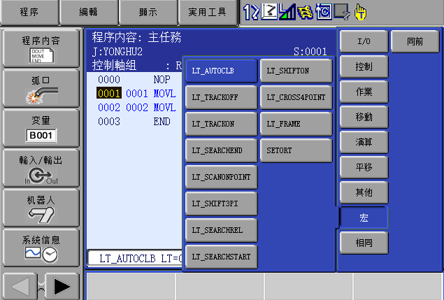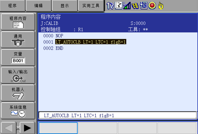 使用 LT_AUTOCLB 进行激光焊缝跟踪器与机器人进行标定,示教编程时使用宏指令LT_AUTOCLB,用于指示激光跟踪功能进行标定计算,参考点必须通过示教登录到 LT_AUTOCLB。