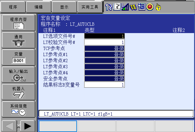打开LT_AUTOCLB登录参考点。将光标移动到宏指令行 LT_AUTOCLB,然后向右移动光标,按下选择键,再按选择键进入 LT_AUTOCLB 参数设置。参数如下: