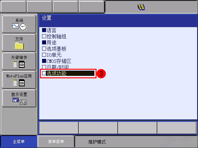 进入 维护模式后,在主菜单中依次选择系统>设置>选项功能。