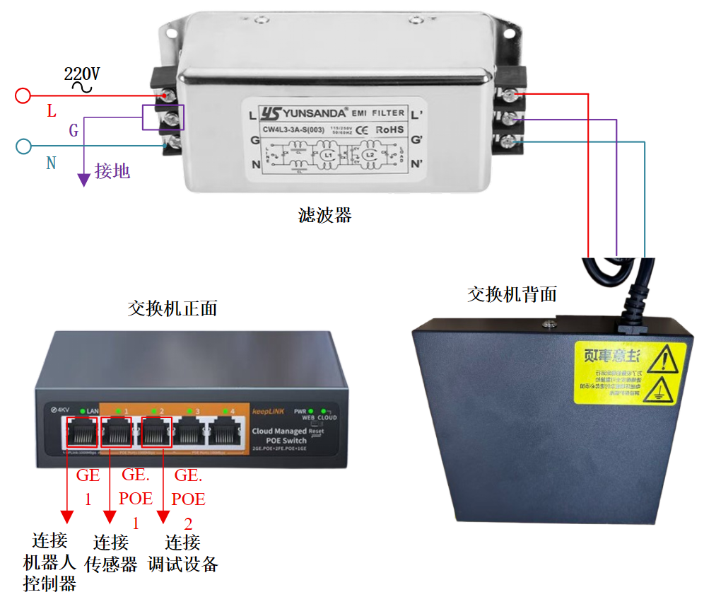 滤波器和交换机通过滤波器中间端子接地,与强电地分开,确保接地可靠。