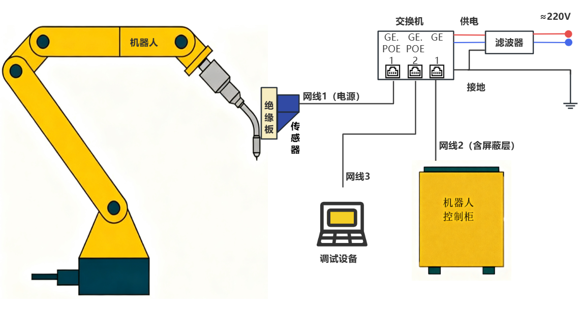 连接机器人的网线2需用屏蔽线,且不能连接带POE供电的网口。