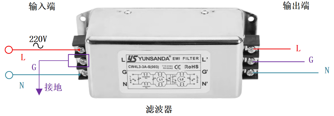 首先将滤波器输出端L、N、G端子分别与交换机输入端火线、零线及地线连接后。再将滤波器输入端L、N端子安装插头,G端子接地。如图所示:
