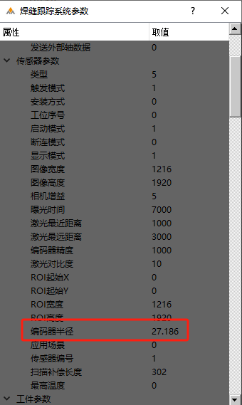 确认焊缝跟踪参数中的编码器精度和编码器半径都有数值;
