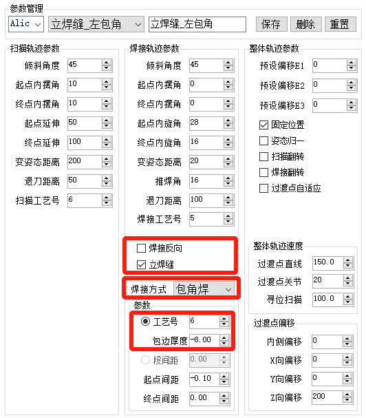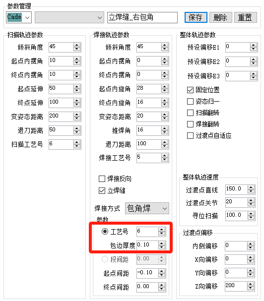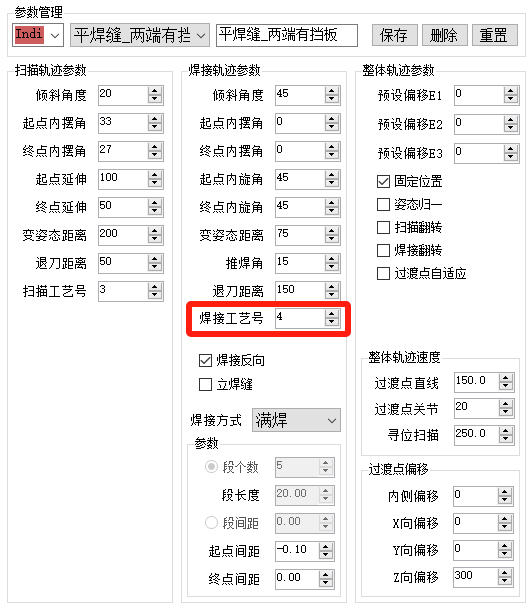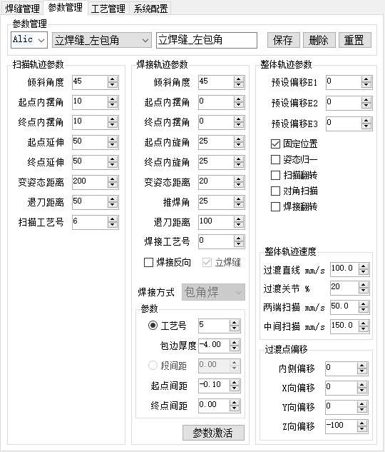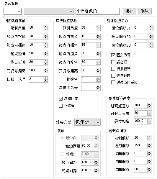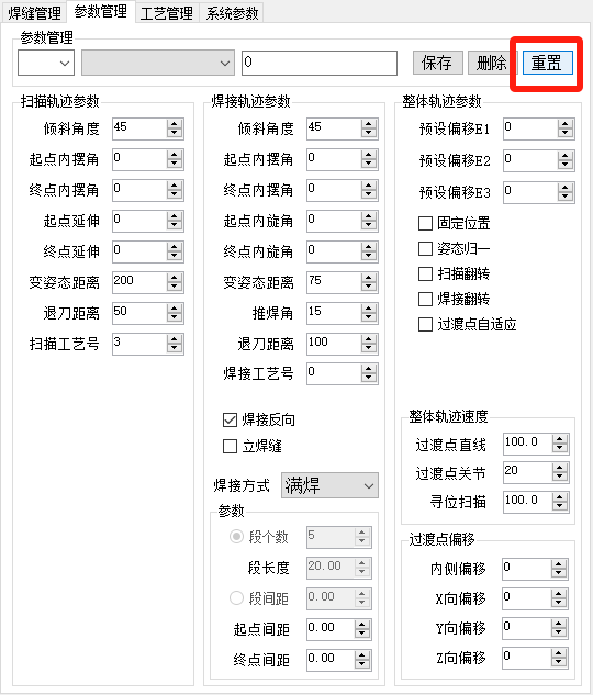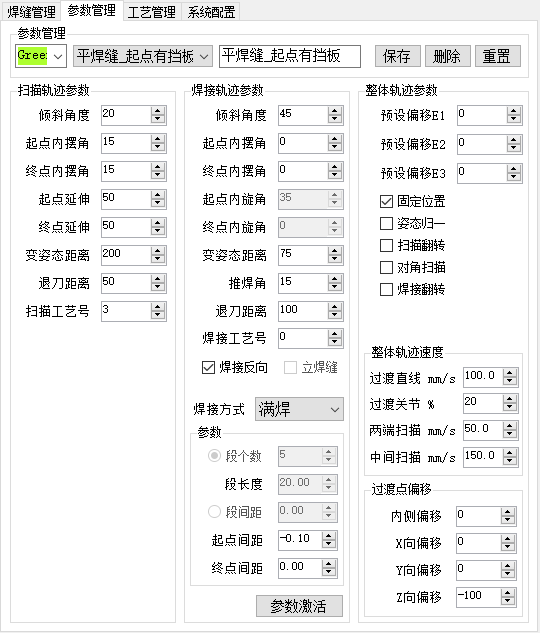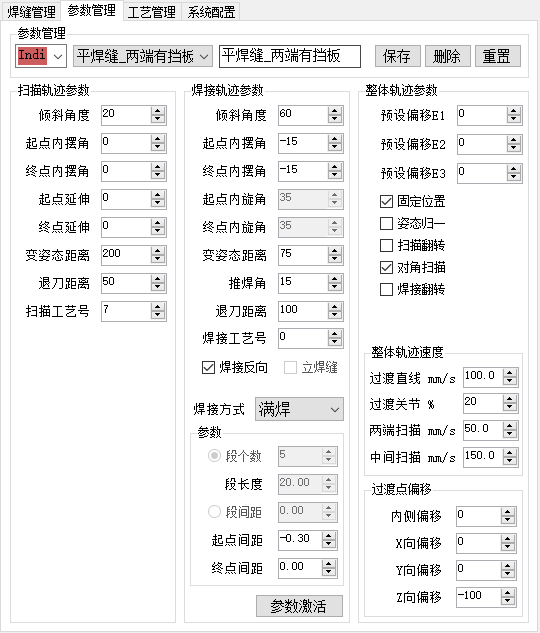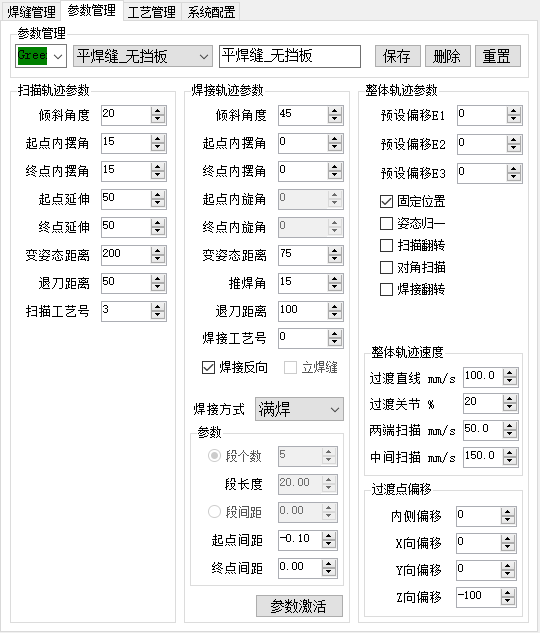 轨迹参数界面由扫描参数、焊接参数、整体参数组成。