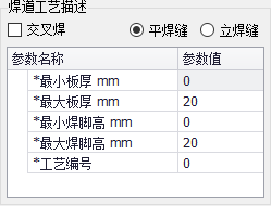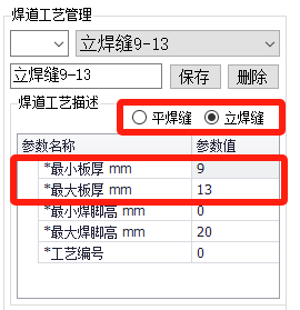 按照板厚匹配,需要设置焊道工艺为平焊缝或立焊缝。然后设置当前工艺适用的最小板厚和最大板厚。当当前焊缝的板厚在该工艺的最小板厚和最大板厚之间,则会匹配到该工艺。