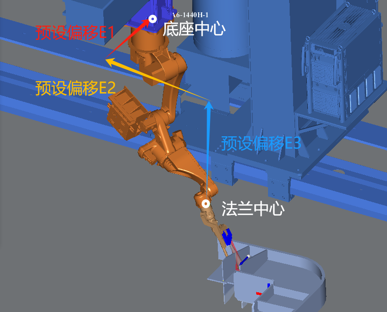 预设偏移E1/E2/E3表示从法兰中心到底座中心分别沿世界坐标系XYZ方向的三个分量。用于确定带外部轴的机器人焊接姿态。