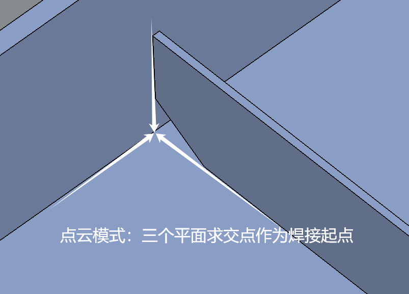 点云模式中,用激光扫过的三个平面求交点,可以精确获得三个面的交点,这个点作为焊接起点。