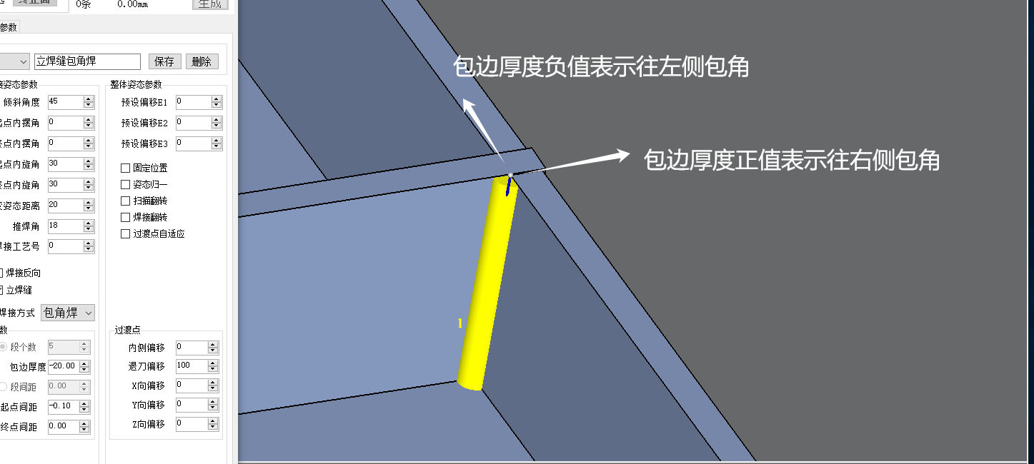 左包角和右包角姿态参数:勾选立焊缝,且焊接方式为包角焊,则认为是立焊缝包角焊。其中,包边厚度为负数表示左包角,包边厚度为正数表示右包角。