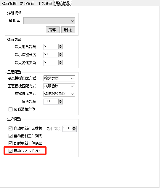 路径焊接界面,系统参数页面,勾选:自动带入过孔尺寸,则离线软件会自动将过孔尺寸的起点或终点偏移量加入到离线程序里。