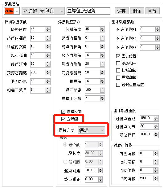 无包角姿态参数:勾选立焊缝,且焊接方式为满焊,则认为是立焊缝无包角。