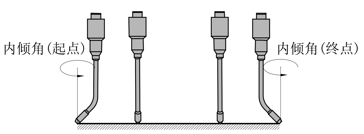 用于设置扫描前段和后段变姿态的距离。两段变姿态距离相同。扫描变姿态距离不会影响焊接变姿态距离。扫描变姿态距离可设置大一些,常用:200mm。