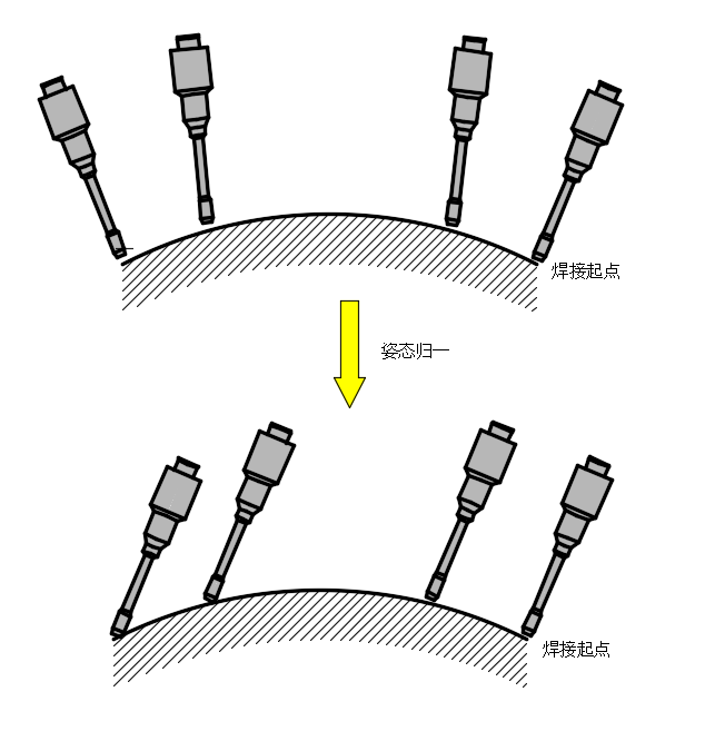 开始段和结束段用于焊枪变姿态,中间段用于固定姿态稳定焊接。
