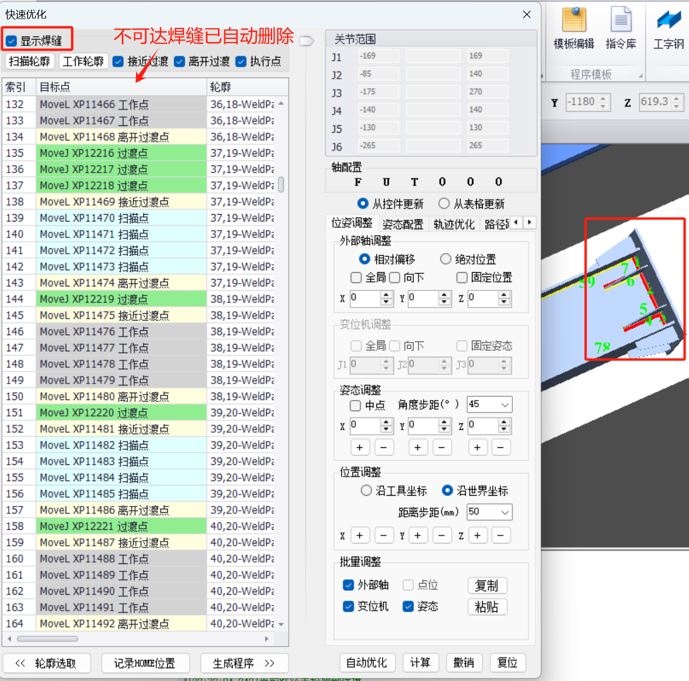 自动过滤掉不可焊接焊缝,自动删除不可达焊缝程序,不可达焊缝会显示红色,便于查看不可达焊缝原因