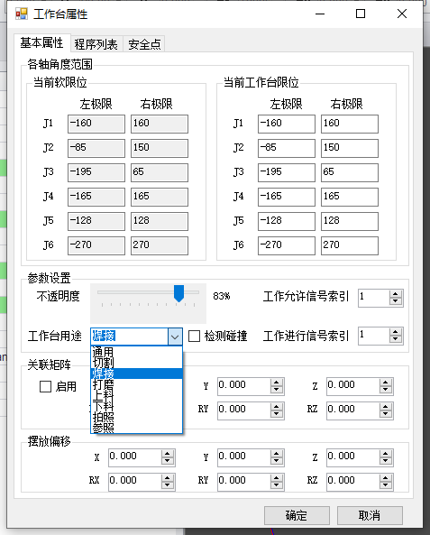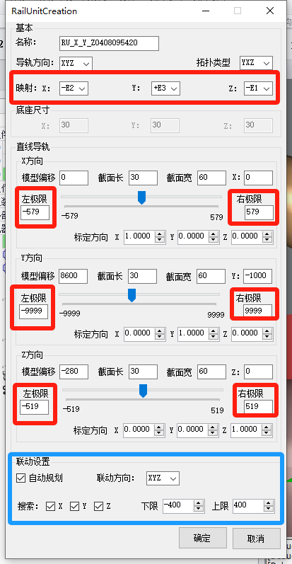 在左右极限位置填入每个方向对应的外部轴值的范围(X为e2范围,Y为e3范围,Z为e1范围)。在设置范围时,需要设置的比实际外部轴范围小一点,这样能避免外部轴刚好运行到极限位置时机器人报警。