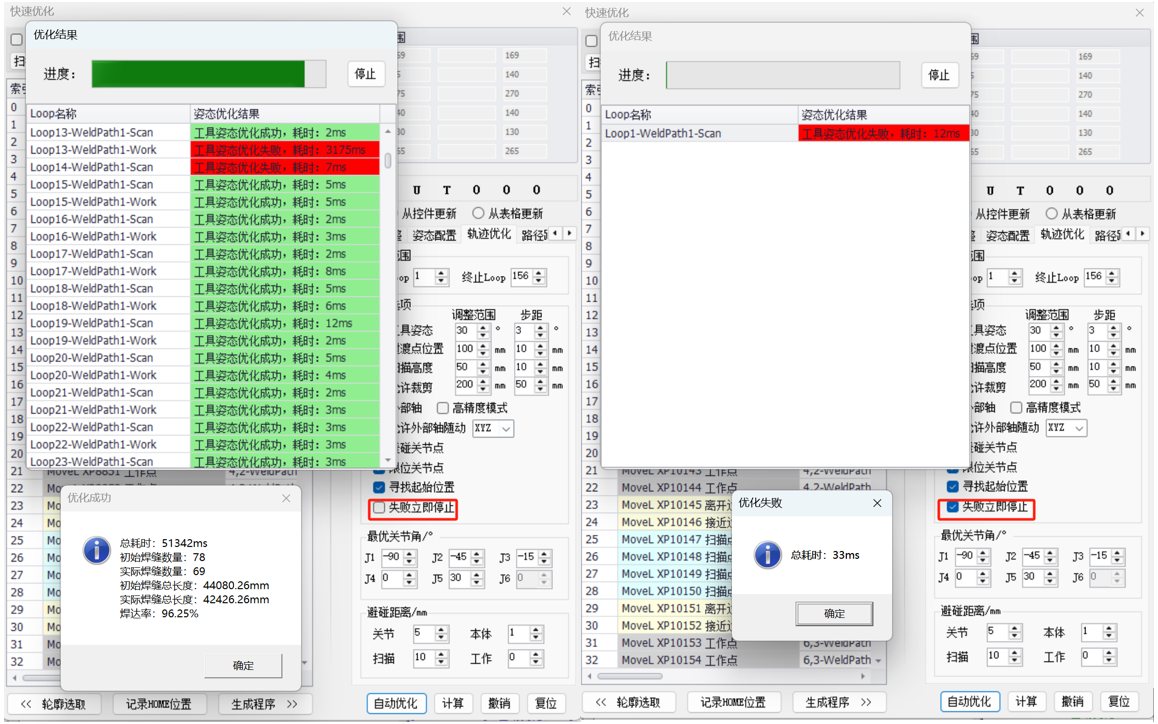 失败立即停止,选择的焊缝有一条不可焊接,自动优化立即停止