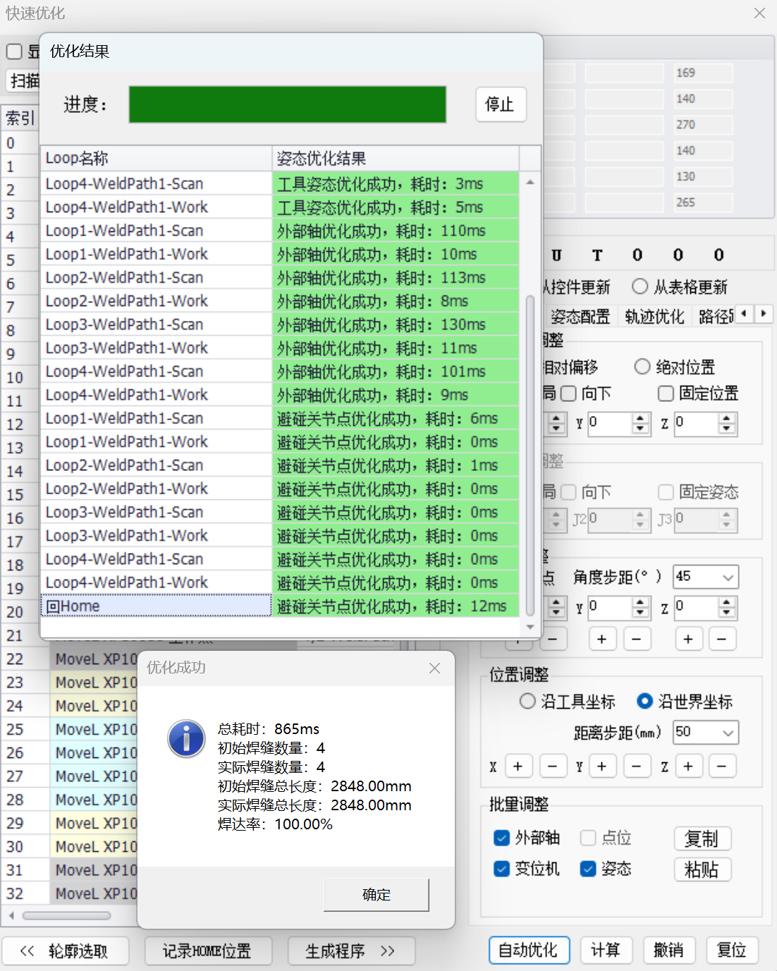 自动优化进度、时间、初始焊缝数量、实际焊缝数量、初始焊缝总长度、实际焊缝总长度及焊达率。
