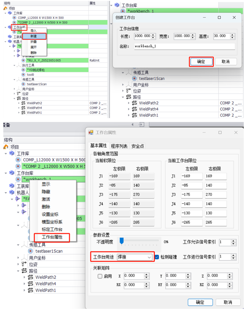工作台用途选“焊接”。为避免工作台与工件穿模导致工件显示不全,可以设置工作台不透明度。为避免焊枪与工作台碰撞干扰后续自动优化,可不勾选“碰撞检测”。