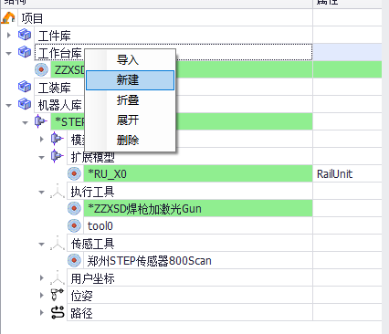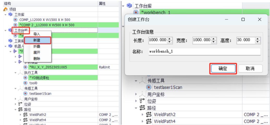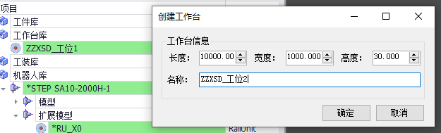 依次点击工作台库>右键>新建,输入工作台尺寸(mm)信息后,单击确定。