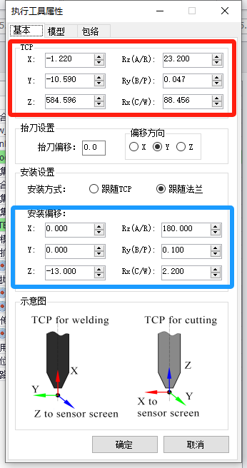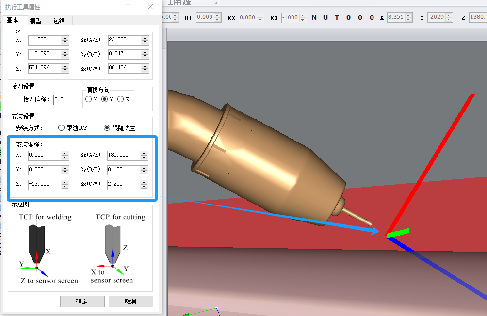 蓝色框中数值可以微调焊枪尖与TCP的相对位置。