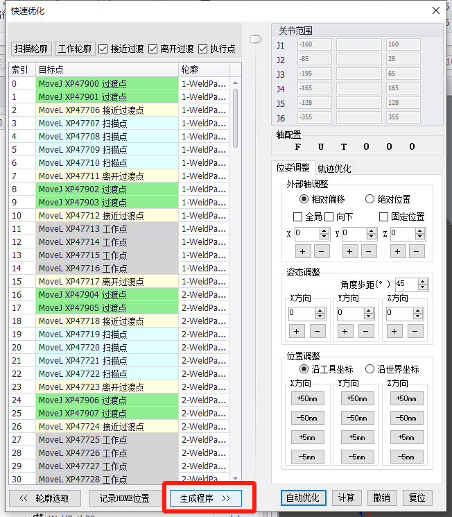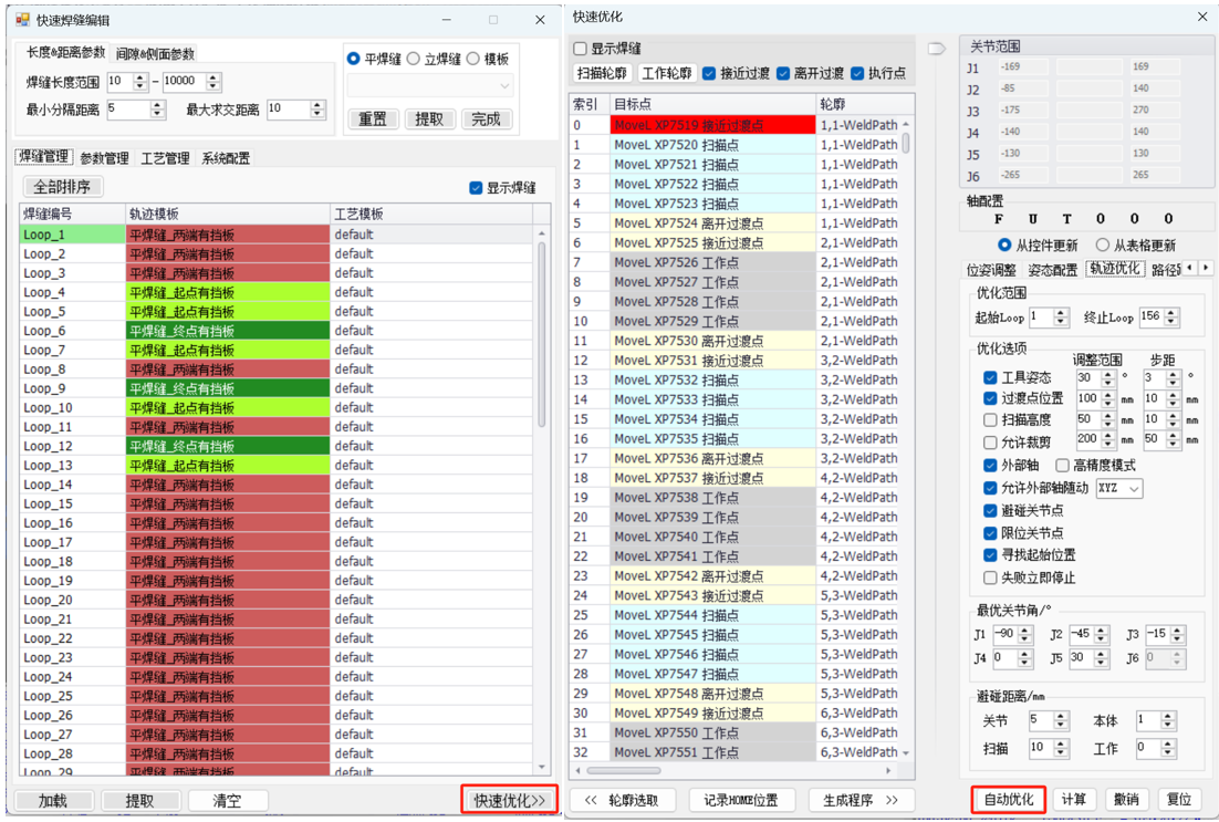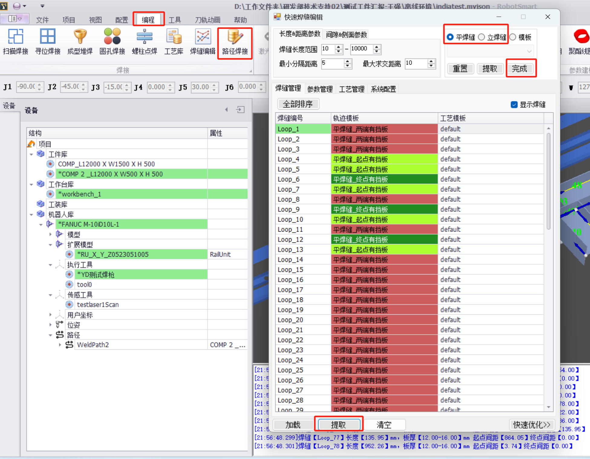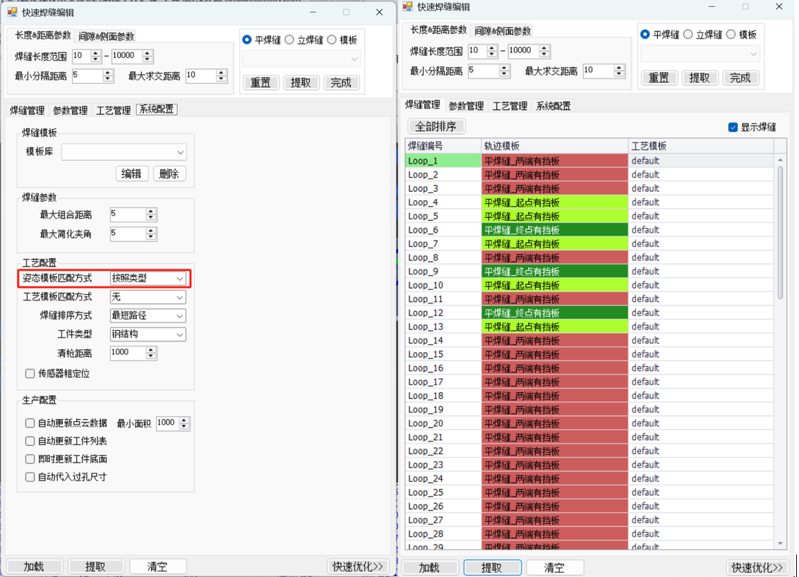 先设置好选项,在自动提取焊缝过程中会自动匹配轨迹参数(软件有轨迹参数库)。