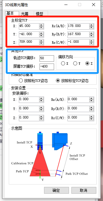 蓝色方框中,屏幕TCP偏移表示从标定tcp位置到光源的高度(即传感器视野)。